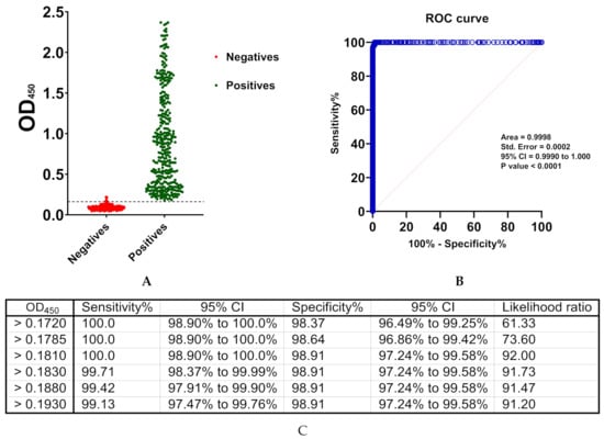 The cut-off value was determined as mean OD450 values of 92 negative samples + (3 × standard deviation). Negative samples belonged to healthy blood donors who were not previously diagnosed with COVID-19. Furthermore, their sero-negative status was confirmed by MN assay. The cut-off value of this developed ELISA was 0.17. All OD450 values of all negative samples were below 0.17 with an exception of a single sample (Figure 2A). The assay offers 98.9% specificity, which was calculated as described (2.5. Statistical Analyses). On the other hand, the OD450 values of all sero-positive samples belonged to COVID-19 recovered patients and confirmed by MN assay were above 0.17 (Figure 2B). Utilizing the described equation (Section 2.6), the sensitivity of the assay was determined as 100% with 98.9% agreement. Although the developed assay should be considered for qualitative applications, a statistically significant correlation with MN titer was observed (Figure 2C). Consistent with the manual calculations, ROC analysis demonstrated an OD450 value of 0.181, as the threshold value distinguishes between positive and negative controls while providing maximum sensitivity (100%) and specificity (98.9%) (Figure 3). ROC also demonstrate an overall high accuracy with area under curve (AUC) equal to 0.9998 ± 0.0002; 95% confidence interval (CI) of 0.99 to 1.00. Coefficient of variation (CV) of inter-assay and intra-assay demonstrated high reproducibility with <10% variation (Figure 3).