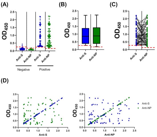 We previously developed and optimized an S-based ELISA that enables sensitive and specific detection of SARS-CoV-2 IgG antibody in human sera [18]. This protocol was subsequently applied in a number of seroprevalence studies [19,20]. Currently, the number of people who are receiving COVID-19 vaccination is escalating. The most commonly utilized COVID-19 vaccines are based on generating protective neutralizing antibodies to the viral S protein [21]. Hence, in order to distinguish between immunized people due to vaccination from those recovered for the infection, S-based ELISA should be combined with reliable NP-based immunoassays. Moreover, most SARS-CoV-2 new variants carry mutations/deletions in the viral S gene [22,23,24,25,26]. Although there is a lack of conclusive evidence that these mutations/deletions can influence the accuracy of S-based serological testing, this possibility still exists, as their effects on S-based vaccine efficiency were reported [23,24,25,26,27].