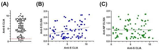 The 90 samples of recovered COVID-19 patietns that tested positive by MN assay and NP- and S-based ELISAs were also subjected to an FDA-approved CLIA. Most samples (n = 86) tested “reactive”, which validates results obtained from our developed assays (Figure 5A). With regards to the four samples that tested negative, it is highly likely that these results are false-negative, taken into consideration the reported sensitivity of this CLIA [28]. Statistical analyses demonstrated a correlation between CLIA data and S-based ELISA, but not with NP-based assay (Figure 5B,C, respectively).