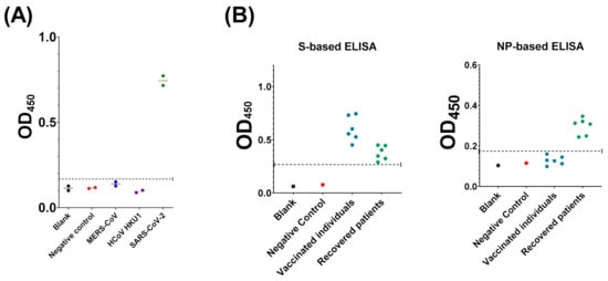 Evaluation of cross-reactivity. (A) Human sera containing IgG antibodies to SARS-CoV-2 (green), MERS-CoV (blue), or HCoV-HKU1 (purple) were subjected to the developed COVID-19 NP IgG ELISA. (B) Samples obtained for vaccinated people (blue) or recovered patients (green) were tested for the presence of IgG antibodies directed to SARS-CoV-2 S protein (left panel) and NP protein (right panel). Negative control (red) and blank (black) were included in all experiments. Dashed lines represent the assay cut-off value.