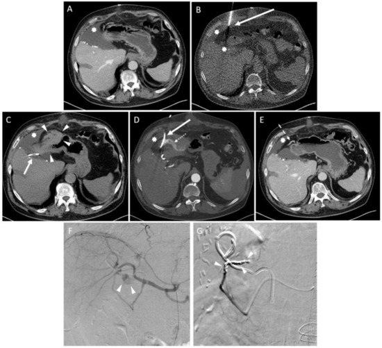 - Kim, Y.J.; Han, J.K.; Lee, J.M.; Kim, S.H.; Lee, K.H.; Park, S.H.; An, S.K.; Lee, J.Y.; Choi, B.I. Percutaneous Drainage of Postoperative Abdominal Abscess with Limited Accessibility: Preexisting Surgical Drains as Alternative Access Route. Radiology 2006, 239, 591–598. [Google Scholar] [CrossRef] [PubMed]