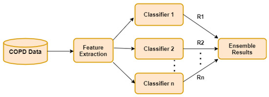 Daily cough and phlegm production are the major signs of chronic bronchitis, which is of a minimum duration of three months a year. The pithiness of breath, wheezing, chest tightness, and chronic cough are the main vital signs of COPD disease. COPD disease is not fully reversible, although proper cure guidance and therapy can slow its infection, minimize its complexity, and help to improve the quality of life of patients [4]. The avoidance of acute exacerbation is the major problem that leads to the fast worsening of a patient’s health condition [5]. Now, here we discuss the exacerbation. Exacerbation does not even have a clear definition yet, because the good relationship between danger factors and the progress of exacerbations is not completely understood [6]. Chronic obstructive pulmonary disease (COPD)-affected people are increasing compared to the past. It may be increasing at a higher rate because our population growth rate increasing over time. It is a global threat, so we need to take action to reduce it; otherwise, it will become the third major cause of death in the world by 2030 [7]. Howbeit, the morbidity and mortality of COPD patients can be reduced, but it is only possible when finding the disease in the early stage [8,9]. In 2012, 3 million people died due to chronic obstructive pulmonary disease (COPD), and this amount is equivalent to 6% of the entire death of that year [10]. Even though pharmacotherapies have improved for COPD, innumerable patients still experience an exacerbation of COPD, during which respiratory signs worsen acutely, and which ascertain disease-associated morbidity rate, mortality rate, resource burden, and healthcare expenses [11]. As reported by the world economic forum (WEF) in 2030, the expenses associated with chronic disease may reach 47 trillion globally. In the past few years, consumption of tobacco has increased; only awareness and proper strategy can reduce its consumption. COPD is ordinarily due to cigarette smoking, even though long-term exposure to other lung nuisances, such as passive tobacco smoke, can also enhance COPD [12,13]; however, in COPD, the major cause is smoking [14]. So far, much research has relied on cohort data for the prognosis of COPD exacerbation. Furthermore, most of them have focused on associated internal factors intrinsic to the COPD victim themselves, instead of external factors [15,16,17]. Moreover, we know that external factors are also contribute to enhancing the exacerbation of COPD patients, such as viral infection and air pollution [18,19,20]. In recent years, supervised machine learning and unsupervised machine learning are working successfully in the field of autonomous diagnosis of many diseases. In this paper, we used a supervised machine-learning technique to seek the severity in COPD patients. Machine learning (ML) models are used to determine the complex problem by extracting medical information; they change the novel ideas into real-time for practitioners and professionals [2]. In real-time clinical practice, models can also perform in decision-making for individual patient cures. These models have a capacity for autonomous diagnosis of many diseases beneath clinical regulations [21,22,23,24]. Moreover, using ML models improves the quality, and minimizing the fluctuations in patients’ rates of medical data can be possible, saving medical expenditure. In the past, the classical machine-learning techniques such as RF, SVM, GBM, XGB, and KNN have been used successfully in the healthcare sector. Aich et al. proposed a framework that used SVM, KNN, DT, and NB for classification of two groups of Parkinson’s disease (PD) patients, using the data from the wearable devices [25]. Chang et al. proposed a solution that used RF, DT, XGB, and SVM for the prediction of hypertension outcomes, using medical data [26]. Abedi et al. proposed a framework that used LR, XGB, GBM, SVM, RF, and DT for the prediction of long-term stroke recurrence [27]. Aich et al. proposed a solution that used SVM, RF, and NB for classifying two groups, namely PD patients with shuffling of gaits and other old adults [28]. Aich et al. also proposed a framework that used KNN, SVM, NB, and DT for distinguishing PD patients from a healthy group of patients [29]. Based on the results of the past studies, we have included these classifiers for our studies. To improve the performance of our proposed framework, we have decided to use an ensemble method to get best out of all of them, instead of using a single classifier for our study. So, we have used the ensemble classifier technique, which finds out the best from the individual classifier, to make a robust model for our proposed system. Moreover, the ensemble classification technique has become a famous topic in the domain of ML and is used to control the limitation of independent classifiers [30]. Ensemble methods aim to integrate the different ML models’ predictions which have different learning parameters and collect the final prediction result with high accuracy. Ensemble classifiers have shown more effective results about the stability and robustness as compared to individual classifier’s performance [31]. The ensemble method decreases the issue of over-fitting and under-fitting during the training and validation [32]. The ensemble system stands on three basic pillars, namely diverseness, the training of every classifier that is part of ensemble system, and integrating the results of all member of classifiers, using weighted majority voting or simple voting to get and combined the result [33]. The performance of the ensemble system depends on the performance of the individual classifiers. If we include more classifiers, the ensemble system will perform better. However, the selection of felicitous classifiers for preparing the ensemble system remains a very arduous topic. Moreover, we know that the performance of all classifiers cannot similar, because every classifier has its param