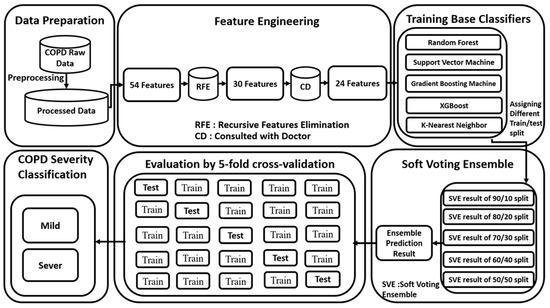 The complete procedure of the development of the system for COPD patients to detect the exact stage of the disease is shown in Figure 2. The entire flow of the experiment is divided into six basic parts, namely the data preparation, feature engineering, training base classifiers, soft voting ensemble, evaluation by 5-fold cross-validation, and COPD severity classification. In the feature-engineering part, two different steps were performed: in the first step, the most relevant features were selected, and in the second step, we consulted with the doctor. After consulting with a doctor, we removed some redundant features that are not valuable. In the third step, six state-of-the-art machine-learning models were developed, namely random forests classifier, support vector machine, gradient boosting machine, XGBoost, and K-nearest neighbor classifier. All the ensemble techniques consist of three things: diversity, training of base classifiers, and a combination of the prediction results of base classifiers. Diversity of an ensemble method defines that all machine-learning base classifiers must be individual as much as possible and their learning ability and decision boundaries should be dissimilar from each other. The use of different machine-learning classifiers with numerous parameter boundaries is an approachable method to better the diversity of an ensemble method. All of these machine-learning-based classifiers are trained with selected features so that they can generate different prediction models with their learning ability and decision boundaries with the same input data. It makes sure that every classifier generated numerous prediction models beneath their decision boundaries and learning ability with training parameters.