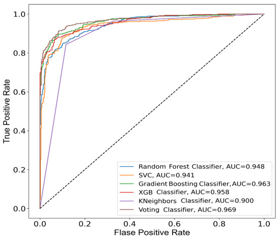ROC–AUC curve of the proposed SVE method and the five classifiers.