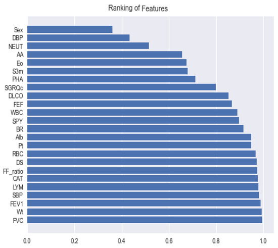The aim of this study was to develop a system that diagnoses the stage of severity of disease in COPD patients in a precise manner. For this purpose, the most crucial 24 features were selected and used for training. The importance (ranking) of the features is given below, in Figure 4. After that, we applied five different machine-learning classifiers, and at the end, the prediction results of all classifiers were integrated, using the soft voting ensemble method. Our proposed method for the classification of COPD got a significant result with an accuracy of 91.0848% and an AUC score of 96.8656%.