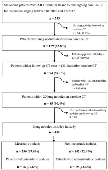 Lung nodules are frequent findings on chest CT scans [9,10,11]; however, most of them are benign [12,13]. In the specific setting of staging chest CT in melanoma patients, differentiating between metastatic and non-metastatic nodules at baseline CT scans is difficult although of high clinical and prognostic relevance.