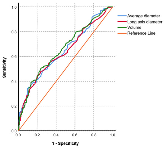 Receiver Operating Characteristic (ROC) curve illustrating the Area Under the Curve (AUC) for average nodule diameter (blue), maximum long axis diameter (red) and nodule volume (green) to predict metastases. There were no significant differences between ROC curves calculated with DeLong’s test (p = 0.059–0.325).