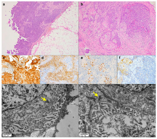 An unexposed, 69-year-old woman presented with a right pleural effusion. She had a history of right breast cancer treated with a quadrantectomy with adjuvant chemo-radiotherapy followed then by right mastectomy for locoregional recurrence. Medical thoracoscopy showed significant pleural effusion and multiple nodules. At histology, a diffuse epithelioid growth pattern with papillary structures was seen in the biopsy fragments (Figure 3a). Immunohistochemistry showed weak positivity for calretinin (Figure 3b), D2-40 (Figure 3c), and GATA3 while showing negativity for TTF1, GCDFP-15, BAP1 (Figure 3d), HER2, and progesterone receptor. Estrogen receptors were weakly positive in only 5% of neoplastic cells (Figure 3e). Therefore, the immunohistochemical findings were not decisive in differentiating a pleural localization of the breast cancer versus a primary tumour of the pleura. Ultrastructural analyses from FFPE sections showed most of the neoplastic cells with elongated, branched microvilli without glycocalyx and with tight junctions (Figure 3f–h). Based on these findings, the diagnosis was malignant epithelioid mesothelioma of the pleura. The patient underwent a pleurectomy after adjuvant chemotherapy. The histological analysis of the surgical specimen further confirmed the diagnosis of mesothelioma rather easily through a better yield of immunohistochemical analyses.