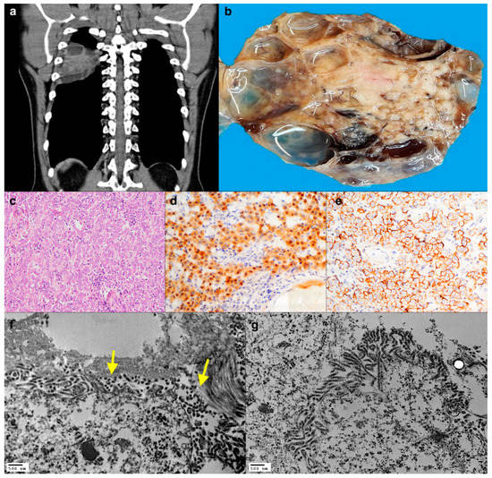 Figure 2. CT scan showing an intrathoracic mass with peripheric cystic changes (a), as visible at the cut surface of the gross specimen (b). At histology, the tumour comprised epithelioid cells with eosinophilic cytoplasm and brisk lymphocytic infiltrate (c, haematoxylin and eosin stain, original magnification ×200) that were immunoreactive for Calretinin (d, immunoperoxidase staining, original magnification ×200) and D2-40 (e, immunoperoxidase staining, original magnification ×200). TEM showing the presence of numerous microvilli in direct contact with collagen bundles (yellow arrows). Although some morphological details are affected by a non-optimal conservation, the structures useful for the diagnostic definition of mesothelioma appear to be well preserved (f,g, original magnification ×12,000, ×10,000).