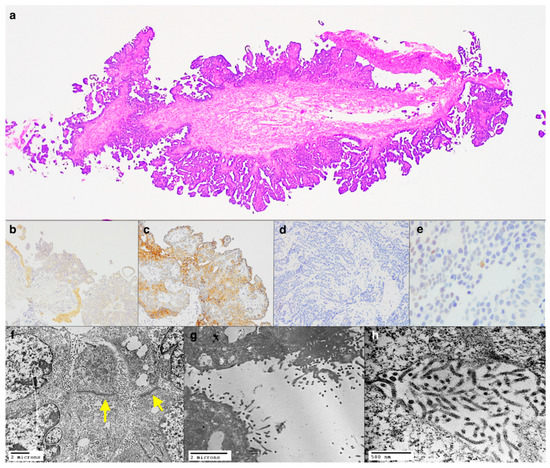 Figure 3. Panoramic view of the pleural biopsy showing a papillary proliferation (a, haematoxylin and eosin stain, original magnification ×25). Immunohistochemistry showing weak positivity for Calretin (b, immunoperoxidase staining, original magnification ×100), D2-40 (c, immunoperoxidase staining, original magnification ×200), loss of nuclear expression of BAP1 (d, immunoperoxidase staining, original magnification ×200), and rare cells positive for estrogen receptor (e, immunoperoxidase staining, original magnification ×400). TEM showing tight junctions (yellow arrows) and branched and elongated microvilli (fh, original magnification ×3500, ×7000, ×30,000).