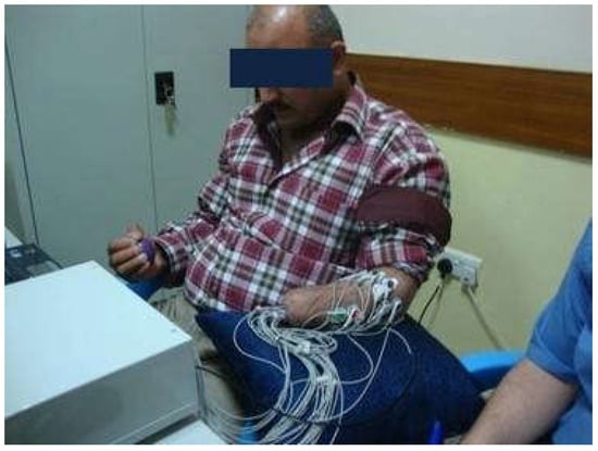The position of electrodes for EMG data acquisition from an amputee. Source: Electromyogram (EMG) repository (rami-khushaba.com) (accessed on 07 May 2021).