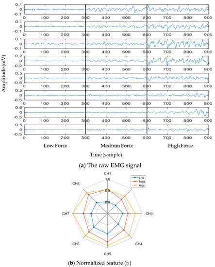 To observe the impact of muscle force variation on a gesture, we considered thumb flexion hand gesture. Figure 3a shows the raw EMG signal for three muscle force levels (low, medium, and high) considering a window size of 150 ms. In addition to the raw EMG signal, one feature (f1) was calculated and is shown in the spider plot (Figure 3b). Both figures indicate that the EMG signal strength increases with respect to the increase in muscle force level. Additionally, it is noticed from Figure 3b that, although the strength of the EMG signal increases with respect to the increase in muscle force level, the muscle activation pattern obtained throughout the channels is almost unique for all force levels.