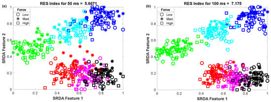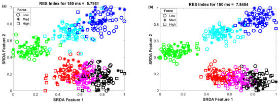 The impact of the nonlinear transformation (logarithm) on the 2D-feature space is shown in the scatter plot (Figure 4). In this scatter plot, we employed 25 sample points for each gesture from the dataset of amputee 1. Thus, the total number of sample points on the scatter plot is equal to 450 (muscle force levels × gesture × number of sample points for each movement = 3 × 6 × 25). The left (Figure 4a) and right (Figure 4b) scatter plots indicate the original features ( and ) and nonlinearly transformed features (, and ). In these figures, each color indicates a gesture. First, the 84-dimensional feature space for each force level is reduced to a 5-dimensional feature space using the SRDA. Thereafter, among this 5-dimensional feature space, the first two were normalized and were used for these scatter plots. The figures show that there is an almost unique muscle activation pattern among the gestures associated with all force levels. Additionally, the logarithm discriminates more for low amplitude values and discriminates less for high amplitude values. Figure 4b shows a higher RES index than Figure 4a, which means that the margin among the gestures is increased. In addition to an improvement in separation margin, the nonlinear transformation also has a more compact cluster among the forces for each gesture.