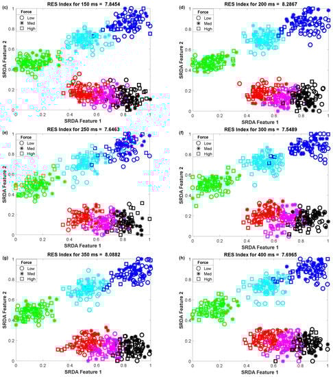 To determine the impact of variable window length on clustering performance, we vary the window length from 50 ms to 400 ms with an equal interval of 50 ms. Then, we observed the scatter plot and the RES index simultaneously, which is shown in Figure 5. In this performance evaluation, the scatter plot visualizes the clustering performance and the separation margin among the gestures, and the RES index indicates their quantitative value. However, to evaluate the performance, we employed 25 sample points for each gesture from the dataset of amputee 1. Thus, the total number of sample points on the scatter plot is equal to 450 (muscle force levels × gesture × number of sample points for each movement = 3 × 6 × 25). First, 84-dimensional feature space associated with each force level was reduced to a 5-dimensional feature space using the SRDA. Thereafter, among this 5-dimensional feature space, the first two features (SRDA feature 1 and SRDA feature 2) were normalized and were used in scatter plots. The experimental results shown in Figure 5 indicate that the clustering performance (RES index) decreases with respect to the decrease of window length. It is also observed that there are some fluctuations in performance (RES index) when the window length is higher than 200 ms. The stochastic nature of the EMG signal may be a reason behind this fluctuation of clustering performance.