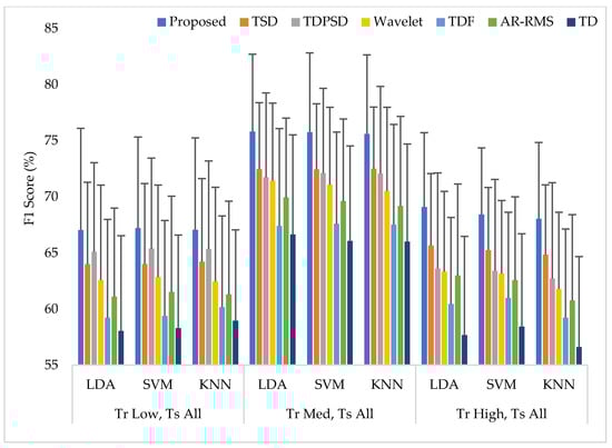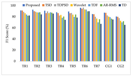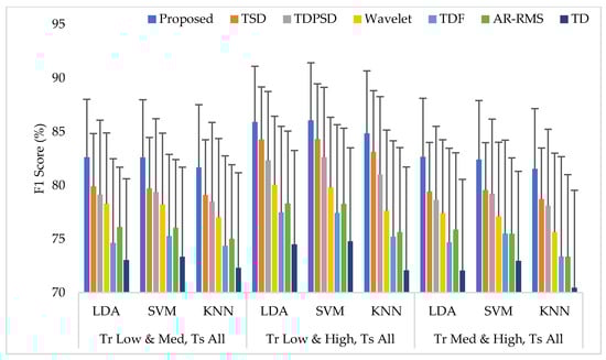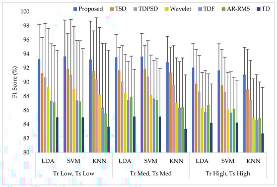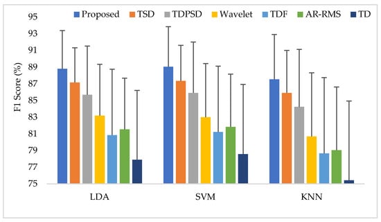 In this case, all force levels were used to train and test the classifiers. Then, the EMG pattern recognition performances in terms of accuracy, sensitivity, specificity, precision, and the F1 score were evaluated for all considered feature extraction methods, which are shown in Appendix A (Table A4). The EMG pattern recognition performances are also graphically shown in Figure 9 using the F1 score only. Following the previous trend, the proposed feature extraction method improves the accuracy, sensitivity, specificity, precision, and the F1 score by 0.57, 1.70, 0.33, 1.53, and 1.70, respectively, compared with those obtained from the TSD using the SVM classifier. In this study, the proposed method yields the highest F1 score of 89.06% with the SVM classifier. Therefore, ANOVA is performed between the proposed feature extraction method and each of the existing feature extraction methods for each classifier. The obtained p-values are very small, and the values are smaller than considering all of the cases, which confirms the significant performance improvement by the proposed feature extraction method.