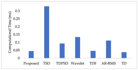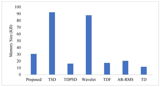 To measure the computational load for each feature extraction method, we considered computational time and memory size [,]. We measured the computational time of each method using an Intel Core i3-7100U CPU with 2.40 GHz processor and 8 GB RAM; we used the MATLAB® 2017a. The recorded computational times shown in Figure 11 demonstrate that the proposed feature extraction method requires the lowest time except for the TD. However, we know that TD offers a very low performance compared to those of the proposed method in all the cases. In addition to the computational time, we also computed the memory size used by each of the feature extraction methods; we used the MATLAB® 2017a function (whos) for this purpose. Figure 12 shows that the proposed feature extraction method requires less memory than those required by TSD and Wavelet. Although TDPSD, TDF, AR-RMS, and TD require less memory than that required by the proposed feature extraction method, their EMG pattern recognition performances are lower than those of the proposed method. Therefore, we claim that the proposed feature extraction method is faster and requires less or compatible memory when recognition performance is taken into account. Therefore, the proposed method is suitable for real-time operation.