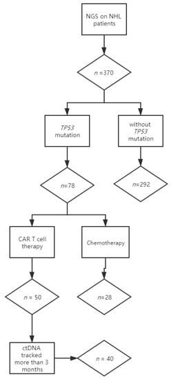 In the present study, we enrolled 370 NHL patients with TP53 mutations confirmed by next-generation sequencing. TP53-mutated ctDNA was subsequently tracked by ddPCR in 40 patients who received CAR T cell therapy. We further investigated whether mutated TP53 ctDNA is a suitable indicator for monitoring the response to treatment and the role of peak circulating TP53 levels in predicting disease progression in these patients. We also analyzed the tumor diameter and other factors to explore their potential for predicting prognosis.