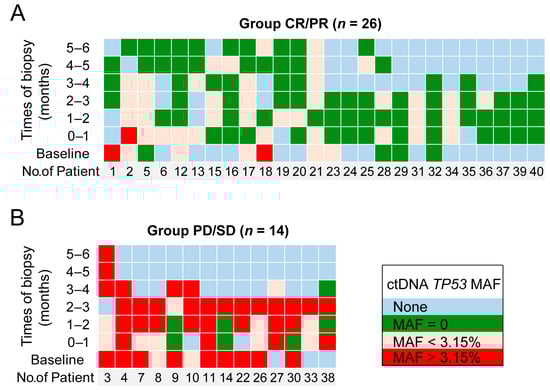 The TP53 MAF predicts disease progression. Each column demonstrates the longitudinal ctDNA results of an individual patient for up to 6 months. The green squares represent undetectable ctDNA levels. The yellow and red squares represent TP53 MAFs less than and greater than 3.15%, respectively. The blue squares represent no samples detected at these time points. (A) Group of patients who achieved complete or partial response; (B) group of patients with stable or progressive disease.