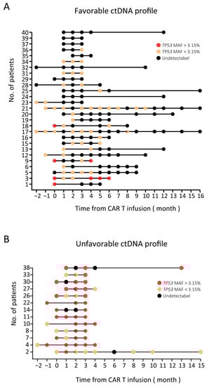 Fourteen patients with stable or progressive disease were defined as group PD/SD and are shown in Figure 2B. In this group, nine patients had high baseline ctDNA levels (TP53 MAF > 3.15%): those of seven patients remained high in the first trimester, and those of the other two patients (patient 3 and patient 9) decreased to less than 3.15% in the first trimester and rebounded in the fourth month. The ctDNA levels of the remaining five patients in group PD/SD all rose to a high level (greater than 3.15%) in the first trimester. These results showed that for CR/PR patients, their TP53 MAF was mostly (25 of 26, 96.2%) undetectable or less than 3.15%. On the other hand, for PD/SD patients, their TP53 MAF was mostly (12 of 14, 85.7%) greater than 3.15%. Then, patients were stratified into two groups depending on their highest ctDNA level in the first trimester after CAR T cell infusion using a MAF cutoff of 3.15%. Patients whose highest TP53 MAF was less than 3.15% in the first trimester were considered to have a favorable ctDNA profile. Conversely, patients whose highest TP53 MAF was greater than 3.15% in the first trimester were considered to have an unfavorable ctDNA profile (Figure 3).
