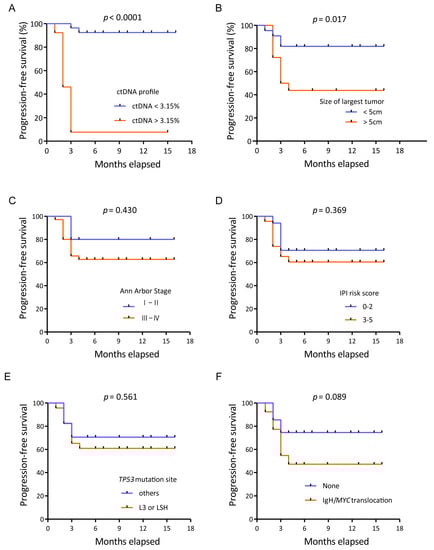 Kaplan–Meier plots of progression-free survival. (A) Kaplan–Meier plots of progression-free survival according to the ctDNA profile. Progression-free survival of patients with an unfavorable ctDNA profile versus those with a favorable ctDNA profile. (B) Kaplan–Meier plots of progression-free survival according to the tumor diameter. Progression-free survival of patients with a large tumor diameter versus those with a small tumor diameter. (C) Kaplan–Meier plots of progression-free survival according to the Ann Arbor stage. (D) Kaplan–Meier plots of progression-free survival according to the IPI risk score. (E) Kaplan–Meier plots of progression-free survival according to the TP53 mutation sites. (F) Kaplan–Meier plots of progression-free survival according to the IgH/MYC translocation.