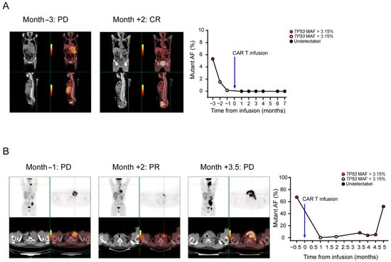 To study the ability of ctDNA to reflect tumor burden, we assessed the concordance of consecutive ctDNA levels with the radiology results. As shown in Figure 5A, patient 23 was diagnosed with DLBCL, and the disease burden declined as the patient achieved CR after CAR T cell therapy. Plasma molecular disease at baseline was positive, decreased to less than 3.15% and then dropped to zero. As shown in Figure 5B, patient 3 was diagnosed with FL, and the disease burden declined in the first 2 months as the patient achieved PR after CAR T cell therapy. However, the patient relapsed as the disease burden rose in the third month. Plasma molecular disease at baseline was positive, decreased to less than 3.15% in the first two months and then increased to greater than 3.15% in the third month. ctDNA levels change as the tumor burden changes, with escalating levels in PD, low levels in PR and declining or undetectable levels in CR. Moreover, the mean time to detect disease progression with the TP53 MAF was shorter than that with CT imaging in 14 PD patients, specifically, there were four patients that had a positive result with ctDNA level earlier than that with CT imaging (Supplementary Figure S2), with a mean lead time of 1.3 months (range 1 to 2 months). This result suggests that occult disease can be detected by plasma ctDNA levels before detection by PET/CT. These results also show that ctDNA monitoring has better specificity for relapse detection than CT imaging.