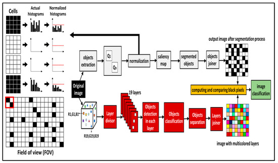 Equation (1) shows that each color image will be divided into nineteen sub-grayscale images. This division will make it more efficient to deal with the grayscale images. In our proposed methodology, we use 19 colors from wheel 7. This means that the 19 colors will be derived from the seven basic components of a color, which may contain red, blue, yellow, white, black, colorless, and light. Thus, they can be easily monitored and detected using 24-bit color, assuming that the image can be converted to a K × L image histogram with intensity i. Then, for each pixel p, there is an intensity i. Then, pi refers to a pixel with its intensity, and the number of pixels is n. The image intensity will be the two image dimensions’ matrix and relates them to the surface coordinates, excluding the intensity that fails to be recorded in the image. Then the image intensity (IS) will be defined in terms of the two image dimensions’ matrix (DM) and the intensity that fails to be recorded in the image (IF), as follows: