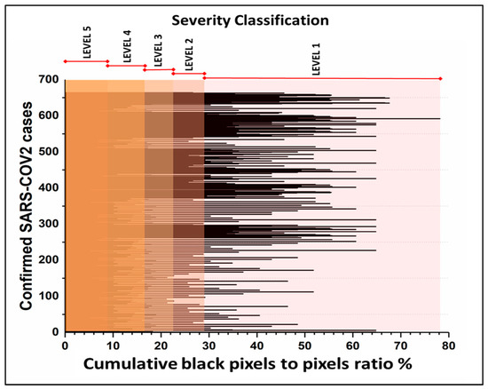 The proposed methodology relies on measuring the impact of COVID-19 on the lungs. This effect appears in X-ray images as bright pixels in the lungs’ shadow area. Bright pixels indicate the presence of swelling in the alveoli affected by the virus [35]: the more bright pixels, the more severe the disease. The number of dark pixels in the original image is measured in relation to the total number of pixels in both the original X-ray and the multi-colored X-ray. Then, the difference between them is measured. The proposed methodology takes this difference as an indicator of the severity of the disease; the smaller this difference, the more the white pixels increase, as does the severity of the disease. This difference is classified into five levels, with the fifth level indicating the highest degree of severity. At this level, there is little difference between the numbers of black pixels in the original image and the multi-colored image. The first level means that the virus does not control the lung; in this case, there is a noticeable difference between the numbers of black pixels in the images.