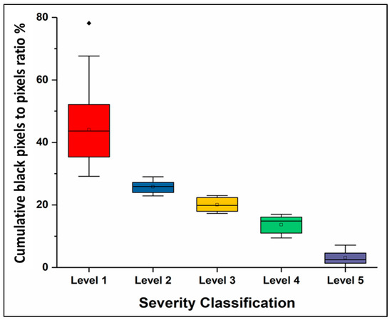 Box plot represents the severity levels of the disease based on the data retrieved from the X-ray images and the cumulative black pixels to total pixels in the ROI.