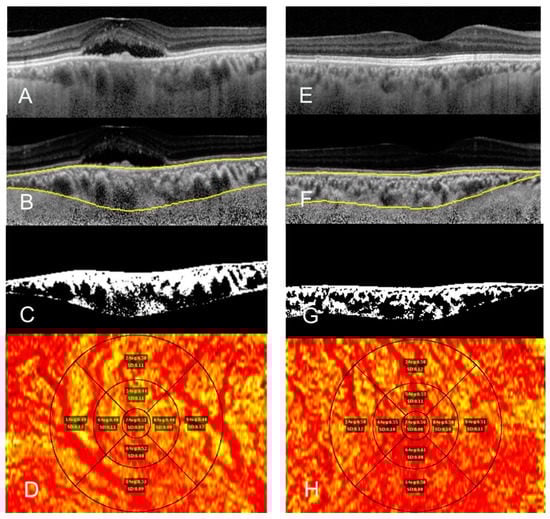 Comparison of choroidal vascularity index mapping of a 52-year-old female showing optical coherence tomography raw image of central serous chorioretinopathy (CSCR) eye (A) and fellow eye (E), choroid segmentation using an automated algorithm after shadow compensation of CSCR (B) and fellow eye (F); and binarized image (C,G). ETDRS grid-based choroidal vascular index (CVI) map images shows mean and standard deviation of CVI at the center, the 3-mm zone, and the 6-mm zone in each quadrant of CSCR eye (D) and fellow eye (H). (D,H) Red color shows choroidal vessels and yellow color shows choroidal stroma.