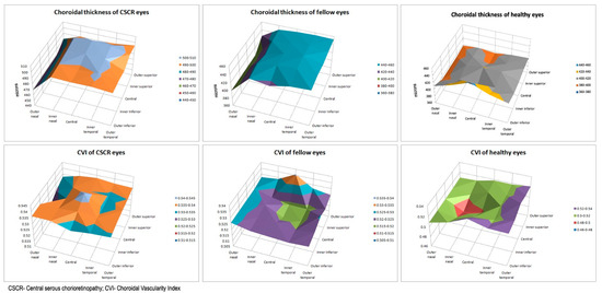 Figure 2 shows the graphical representation of the topographical distribution of CT and CVI values. A smooth rise in the CT values was seen towards the central area in CSCR and fellow eyes. A sharp rise in CVI was seen centrally and superiorly in CSCR eyes but a central reduction was seen in fellow eyes. A nasal decline in CVI values was seen in the CSCR group in contrast to an increasing trend in fellow eyes.