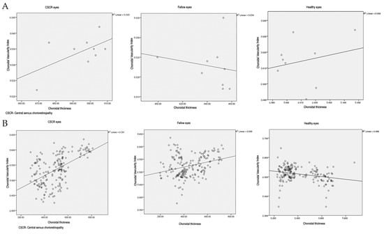 In CSCR eyes, a positive correlation was seen between CT and CVI values (r = 0.58, p = 0.1). There was a weak correlation between CT and CVI in fellow eyes (r = −0.183, p = 0.64) and healthy eyes (r = 0.236, p = 0.54) (Figure 3A). The correlations were not statistically significant.