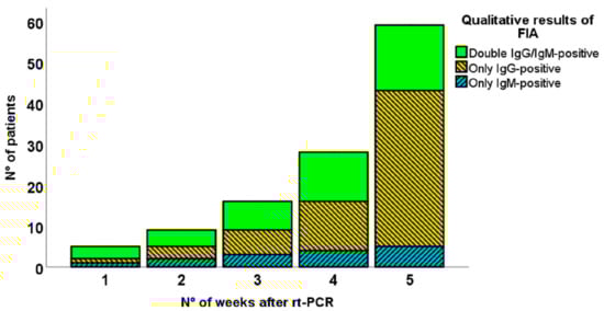 In this work, two serological tests, both based on microsampling (20 and 30 µL of blood, respectively) obtained with finger pricking and fast analysis (10 min), were carried out. An initial result of this work highlights that the reliability of serological testing is strictly time dependent; a delay of at least 14 days between rRT-PCR testing and serological tests is optimal. Concerning IgM and IgG positivity, IgM positivity resulted in lower concentrations and was significantly less present in the observed population, while IgG positivity was prevalent around the second week, reaching the maximum sensitivity before 21 days. A small percentage of patients were negative to serological tests even at 21 days after PCR positivity; this phenomenon could depend on a particularly delayed or absent humoral adaptive immune response [24,25,26,27]. In particular, delayed seroconversion was found to be significantly associated with older age (>80 years old, p = 0.010), partially explaining the greater severity of COVID-19 among elderly people. Several reports have showed similar or even higher IgG titers in elderly people [28,29]; therefore, the difference in severity could be related to the timing (more than quantity) of the humoral immune response [24,26]. In fact, these higher IgG titers are probably related to the stronger inflammatory response (particularly Th2 cytokines, e.g., IL-6 [30]) in elderly people [29].