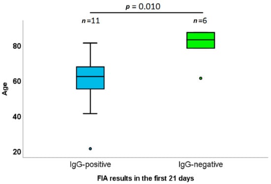 Interestingly, among COVID-19-positive patients, those with undetectable IgG during the first 21 days after rRT-PCR positivity (median 11 days, IQR 7–18 days) were significantly older (median 60 vs. 80 years old, Pvalue = 0.010, Figure 3). No other significant difference was evidenced between positive and negative patients. No differences between age classes were observed later than 21 days.