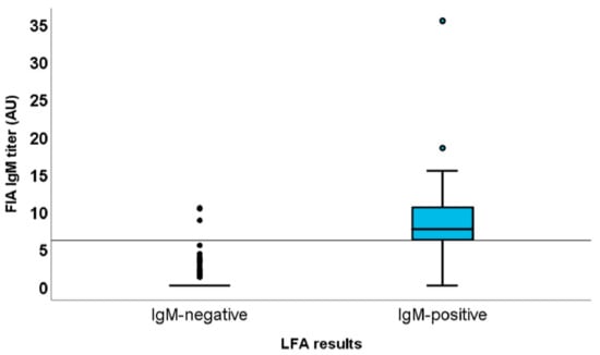 After the evaluation of the analytical performance of LFA and FIA for the determination of patients’ serological status was completed, the concordance between the two tests was further evaluated by Cohen’s K parameter. The 183 coupled determinations showed high diagnostic concordance, with a mean K value of 0.802 (confidence interval 0.758–0.846). The discordant results mainly concerned IgM positivity due to the low sensitivity of LFA. In fact, as shown in Figure 4, 19 out of 21 samples with an IgM concentration lower than 6 AU with FIA were negative with LFA.