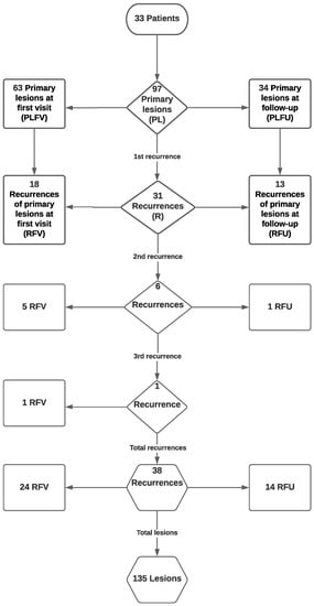 Therefore, out of 135 OL lesions, 97 (71.9%) were PLs and 38 (28.1%) were recurrences. Concerning PLs, 63 (64.9%) were present at patient’s inclusion and 34 (35.1%) were first noticed during follow-up.