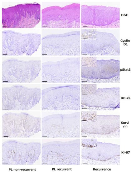 Representative photomicrographs of hematoxylin and eosin (H&E) and immunohistochemical stains of all studied molecules (cyclin D1, pSTAT3, Bcl-xL, survivin and Ki-67) in a non-recurrent primary oral leukoplakia lesion (PL)–1st column, in a recurrent PL–2nd column and in its corresponding recurrence–3rd column (magnification 100×, scale bar 100 μm; for inserts magnification 200×, scale bar 50 μm).