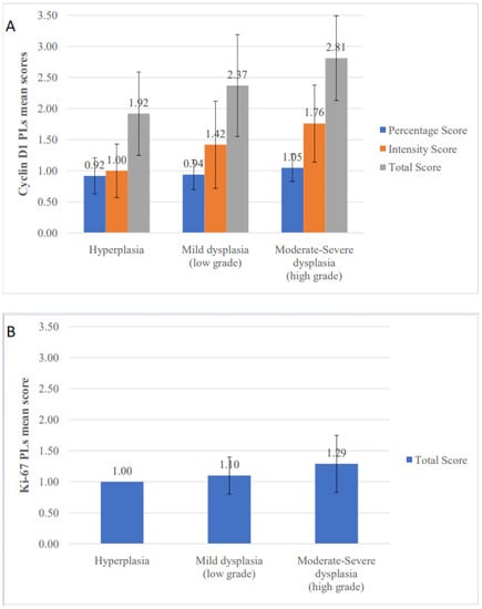 Cyclin D1 IHC scores in PLs were further analyzed according to the presence and degree of dysplasia. It was noticed that high grade dysplasias (moderate and severe) received higher mean total scores compared to hyperplasias and mild dysplasias (Figure 4A). Statistically significant differences were found for intensity and total scores (p = 0.004).