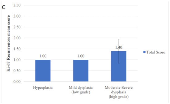 Comparison of mean immunohistochemical scores according to the presence and degree of dysplasia. (A) Cyclin D1 percentage, intensity and total scores in primary oral leukoplakia lesions (PLs), (B) Ki-67 total score in PLs and (C) Ki-67 total score in recurrences.