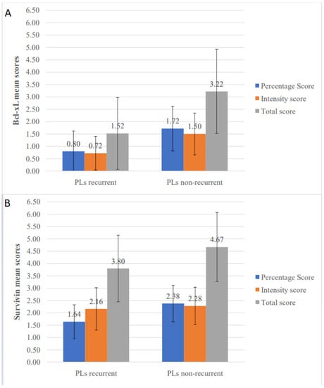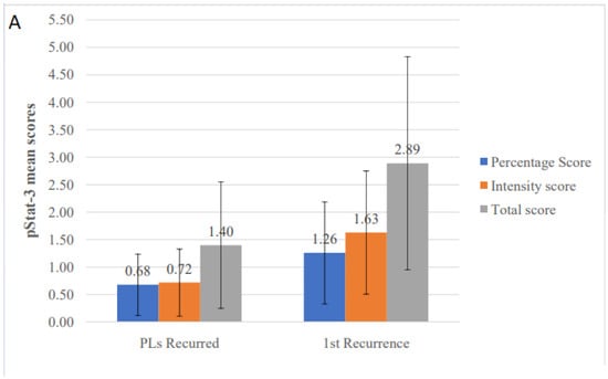 When IHC expression levels of various studied molecules were compared between the two groups, higher mean total values were seen in the recurrences compared to their corresponding PLs for cyclin D1 (2.84 vs. 2.36), pSTAT3 (2.89 vs. 1.40) and Bcl-xL (3.58 vs. 1.52), but not for survivin (3.74 vs. 3.80) and Ki-67 (1.11 vs. 1.20). For pSTAT3, both total (p = 0.018) and intensity (p = 0.009) scores were statistically significant higher in recurrences with percentage score showing a tendency towards significance (p = 0.054) (Table 7 and Figure 6A). Similarly, significantly higher values for Bcl-xL were noticed in recurrences compared to PLs for percentage (p = 0.007), intensity (p = 0.006) and total (p = 0.005) scores (Table 7 and Figure 6B). No significant differences among PLs and their recurrences were found for the other molecules, although cyclin D1 total score and survivin intensity score almost reached statistical significance (p = 0.070 and p = 0.059, respectively) (Table 7).