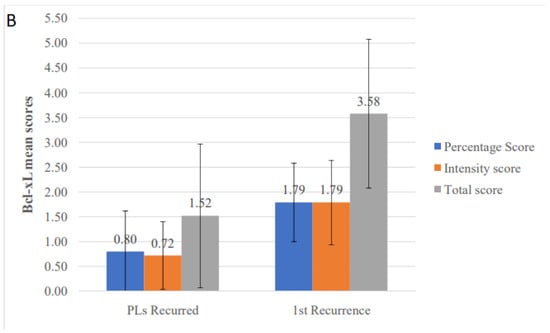 Comparison of immunohistochemical mean scores of (A) pSTAT3 and (B) Bcl-xL, between primary oral leukoplakia lesions (PLs) that recurred and their corresponding first recurrences.