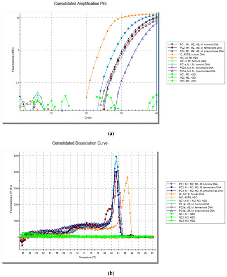 Specificity of Test-1 v.1 and Test-1 v.2 performed for qPCR with M1; M2; and M3 qPCRs, (a) amplification plots and (b) dissociation curves of qPCR products with maximum temperature melting (Tm) peaks. PC1 (triplex qPCR), PC1a (single qPCR)—positive control with 0.05 ng M. hominis; DNA standard and accordingly PC2, PC2a with M. fermentans; PC3 PC3a with M. pneumoniae; IC—internal control with ACTB Fw, Rv primers and 10.0 ng of human DNA; NIC—negative internal control with H2O instead of DNA template; NC1-3—negative controls with M1, M2, and M2 Fw and Rv primers.