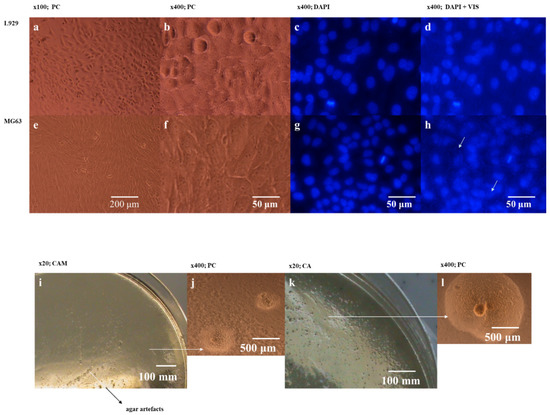 Cell cultures cell culture under phase-contrast (PC) microscope (a) L929 (mouse fibroblast cell culture) 100×, (b) L929 400×; (e) MG63 (osteosarcoma cell culture) 100×, (f) MG63 400×; DAPI—stained cell images shown under DAPI—filter (c,g); DAPI—filter and visible light (VIS) (d,h); Arrows in subfigure h show a slightly stronger glare of the peripheral part of cells. In that case mycoplasma contamination is suspected. M. arginini colonies cultured on Mycoplasma Agar Base (MAB) supplemented with mycoplasma selective supplement-G directly examined after a week (i) and 2 weeks (k) by the camera with 20× zoom; M. arginini colonies and under inverted microscope at 400× magnification after a week (j) and 2 weeks (l).