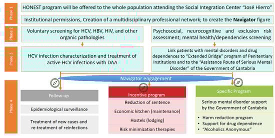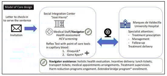 Following our previous experience in the prison setting [], we carried out the study with a multidisciplinary team at SIC end and Valdecilla University Hospital. It included four phases depicted in Figure 1. In this setting, we created a new figure we named “Navigator.” There are some similar experiences [] recently published. We generated this figure, the Navigator to serve as a support at the correctional setting to set a continuum of health attention to subjects and engage them with global health evaluation, hepatitis C screening, and linkage to care. In our region and widely in Spain [], HCV diagnosis is performed with a single blood sample, which is called reflex test: this means that once the HCV antibody is detected positive, automatically a RNA detection is performed in the same blood sample. In this setting, we incorporated point of care tests to detect active infection in a single visit from capillary blood. First, antibodies to HCV were detected with Oraquick® HCV Rapid Antibody test (OraSure Technologies, Bethlehem, PA, USA) in capillary blood and, if positive, the Xpert® HCV VL Fingerstick assay was performed on a Gene Xpert® System (Cepheid, Sunnyvale, CA, USA) to quantify HCV RNA.