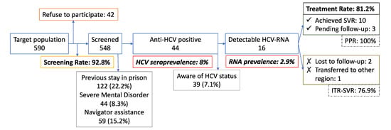 - Crespo, J.; Llerena, S.; Cobo, C.; Cabezas, J. Is HCV elimination possible in prison? Rev. Esp. Sanid. Penit. 2017, 19, 70–73. [Google Scholar] [CrossRef] [PubMed]