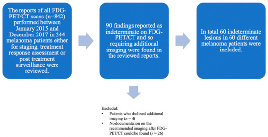 Flowchart showing lesion selection with all included and excluded lesions. The reports of all FDG-PET/CT scans (n = 842) performed between January 2015 and December 2017 in melanoma patients (n = 244) in clinical routine either for staging, treatment response assessment or post treatment surveillance were considered. Initially, 90 indeterminate findings on the FDG-PET/CT requiring additional imaging for further evaluation were retrospectively found in the reviewed reports. Lesions were excluded either when patients declined additional imaging (n = 4) or no documentation on the recommended imaging after FDG-PET/CT could be found (n = 26). In total, 60 indeterminate lesions were included. All included patients (n = 60) with histopathologically proven melanoma who were treated at the Department of Dermatology of the University Hospital Zurich—each patient with one indeterminate finding on the FDG-PET/CT.