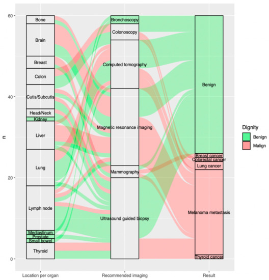 Sankey plot showing, per included indeterminate finding on the FDG-PET/CT (n = 60), on the far left, (a) location per organ; in the middle, (b) recommended imaging for further evaluation; and the far right, (c) outcome of additional imaging. Benign findings are displayed in green, malign findings in red arrows. (a) Location per organ (on the left from the bottom to the top): thyroid (n = 4; 5.0%, small bowel (n = 1; 1.7%), prostate (n = 1; 1.7%), mediastinum (n = 1; 1.7%), lymph node (n = 11; 18.3%), lung (n = 9; 15.0%), liver (n = 7; 11.7%), kidney (n = 1; 1.7%), head/neck (n = 2; 3.3%), cutis/subcutis (n = 6; 10.0%), colon (n = 4; 6.7%), breast (n = 3; 5.0%), brain (n = 8; 13.3%), bone (n = 2; 3.3%). (b) Recommended imaging (in the middle from the bottom to the top): ultrasound guided biopsy (n = 20; 33.3%), mammography (n = 3; 5.0%), magnetic resonance imaging (n = 19; 31.7%), computed tomography (n = 12; 20.0%), colonoscopy (n = 4; 6.7%), bronchoscopy (n = 2; 3.3%). (c) Result (on the right from the bottom to the top): thyroid cancer (n = 1; 1.7%), melanoma metastasis (n = 21; 35.0%), lung cancer (n = 2; 3.3%), colorectal cancer (n = 1; 1.7%), breast cancer (n = 1; 1.7%), benign (n = 34; 56.7%).
