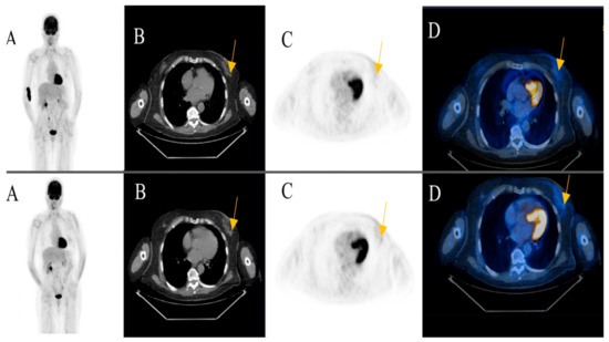 An 81-year-old female patient initially with metastatic cutaneous melanoma stage IV (pT2a N3 M1b). (A) Maximum intensity projection (MIP); (B) Computed Tomography (CT) axial of chest; (C) Positron Emission Tomography( PET) axial of chest; (D) Fused images PET/CT axial of chest. First row: FDG-PET/CT performed for surveillance after treatment without evidence of metabolically active recurrence, nodal or distant metastasis. Contamination at injection site cubital on the right upper extremity. Second row: Six months later, a morphologic and metabolic progredient subcutaneous nodule in the left breast was seen (yellow arrow). An ultrasound-guided biopsy was subsequently recommended for further evaluation. The biopsy revealed an invasive ductal breast cancer.