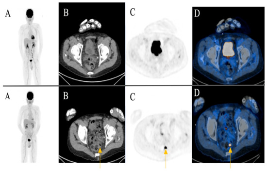 A 72-year-old male patient initially with metastatic cutaneous melanoma stage IIIC (T0 N2b M0). (A) Maximum intensity projection (MIP); (B) Computed Tomography (CT) axial of pelvis; (C) Positron Emission Tomography (PET) axial of pelvis; (D) Fused images PET/CT axial of pelvis. First row: FDG-PET/CT performed for extended staging after left axillary lymphadenectomy without evidence of metabolically active melanoma, nodal or distant metastasis. Second row: Follow-up for treatment response assessment under anti-PD1 monotherapy. Three months after treatment initiation, a new metabolically active wall thickening of the rectosigmoidal colon was seen (yellow arrow). A rectoscopy was subsequently recommended for further evaluation. The biopsy revealed a well-differentiated adenocarcinoma of the colon.