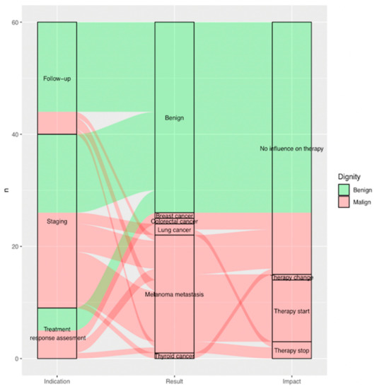 Sankey plot showing, per included indeterminate finding (n = 60), on the far left, (a) indication of FDG-PET/CT scan it was reported on as indeterminate; in the middle, (b) result of additional imaging; and on the far right, (c) impact of additional imaging on clinical management. Benign findings are displayed in green, malignant findings in red arrows. (a) Indication (on the left from the bottom to the top): treatment response assessment (n = 9; 15.0%), staging (n = 31; 51.7%) and follow-up (n = 20; 33.3%). (b) Result (in the middle from the bottom to the top): thyroid cancer (n = 1; 1.7%), melanoma metastasis (n = 21; 35.0%), lung cancer (n = 2; 3.3%), colorectal cancer (n = 1; 1.7%), breast cancer (n = 1; 1.7%), benign (n = 34; 56.7%). (c) Impact (on the right from the bottom to the top): therapy stop (n = 3; 5.0%), therapy start (n = 11; 18.3%), therapy change (n = 1; 1.7%) and no influence on therapy (n = 45; 75%).