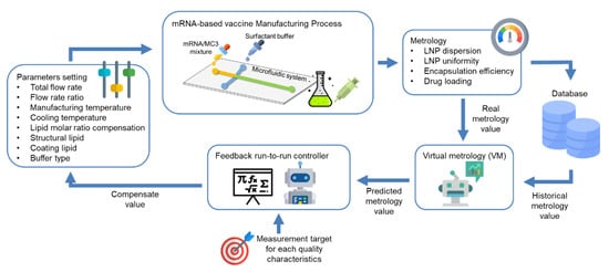 The coronavirus pandemic (COVID-19) caused by severe acute respiratory syndrome–coronavirus 2 (SARS-CoV-2) has threatened public health and caused tremendous social and economic losses []. Since effective treatment alternatives are lacking and infection is increasingly widespread, vaccine development, and smart manufacturing of effective vaccines to conquer this pandemic are vital. A lipid nanoparticle-encapsulated messenger RNA (mRNA-LNP) vaccine that can be swiftly developed and manufactured may efficiently meet unprecedented globalized vaccine demands []. An LNP vaccine manufactured using a microfluidic system offers distinct advantages of scalability, reproducibility, and rapid preparation time []. Although mass production of a vaccine can reduce manufacturing costs and fulfill large-scale urgent demand, vaccine safety remains a primary concern since problematic vaccines may be life-threatening. However, little research has been done to address the quality and suitability of a mass-produced mRNA-based vaccine for smart manufacturing. To ensure vaccine quality, safety, reliability, and yield, we may leverage approaches used in other high-tech manufacturing fields [], such as wafer fabrication, that use precisely intelligent solutions for advanced quality control (AQC), advanced process control (APC), and advanced equipment control (AEC). Manufacturing excellence solutions employed in the semiconductor manufacturing field may be employed to enhance the quality of vaccine bio-manufacturing processes.